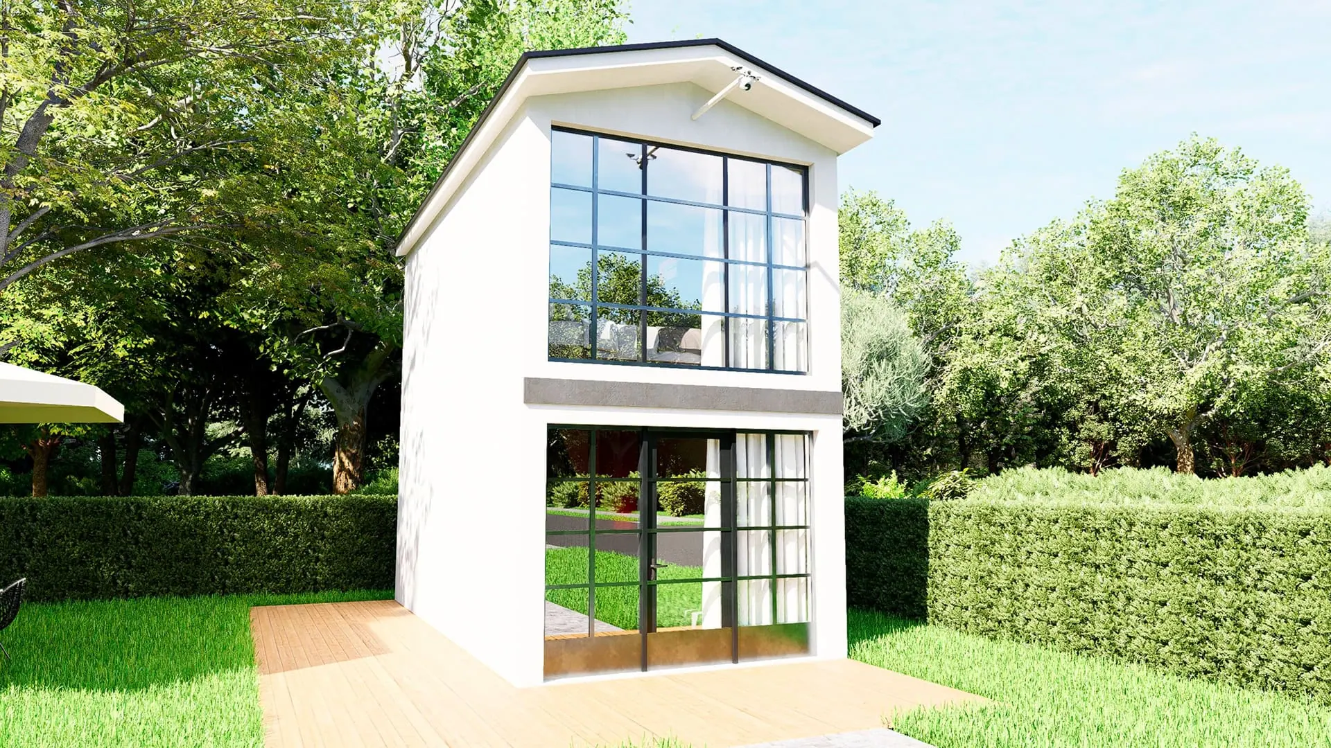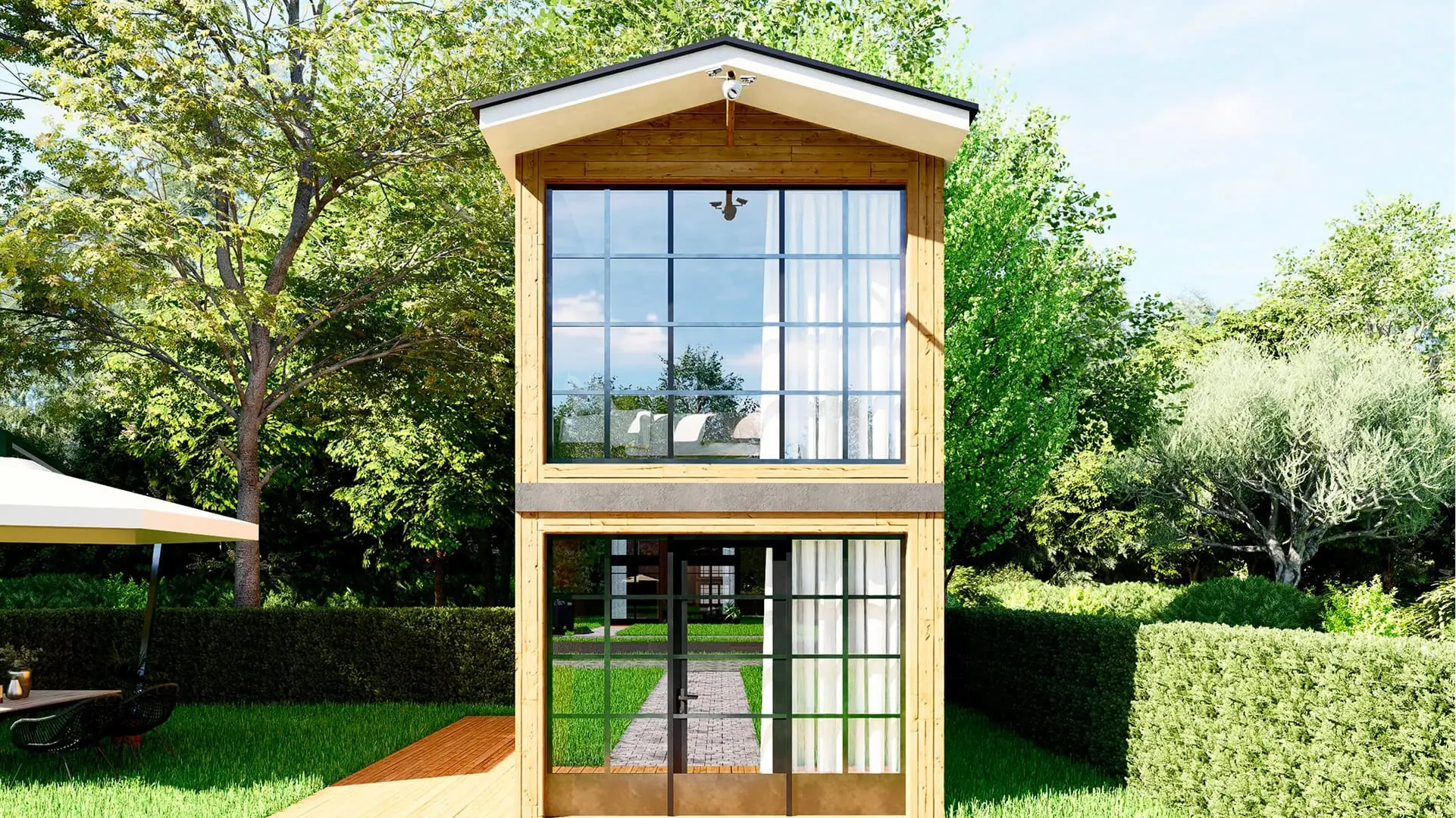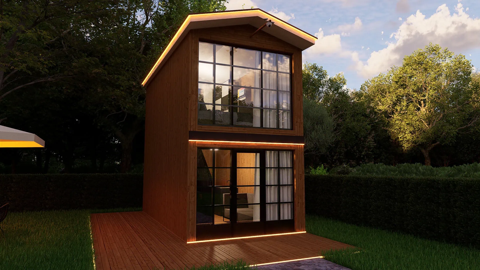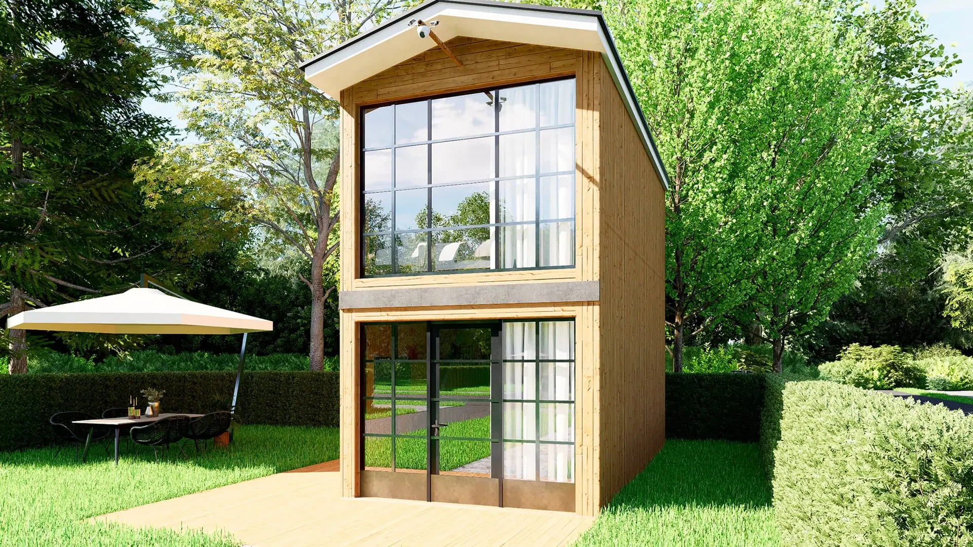 Funkční a stylový dvoupodlažní modulární dům o celkové ploše 44 m², složený ze dvou modulů. Má dvě útulné a promyšlené místnosti a klasickou sedlovou střechu.